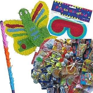 Pinata Set: * Schmetterling * mit + Maske + Schläger + 100-teiliger Süßigkeiten-Füllung No.1 von Carpeta© // Handgefertigte spanische Pinata. Tolles Spiel für Kindergeburtstag oder Mottoparty